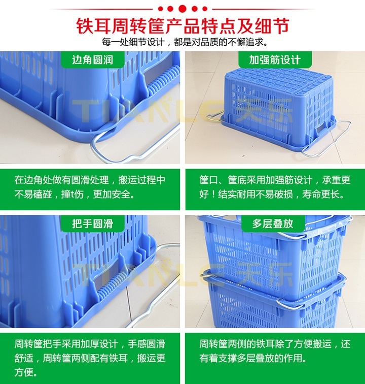 2.周轉(zhuǎn)筐把手采用加厚設(shè)計,手感圓滑舒適,周轉(zhuǎn)筐兩側(cè)配有鐵耳,搬運更方便。